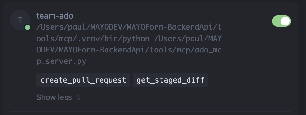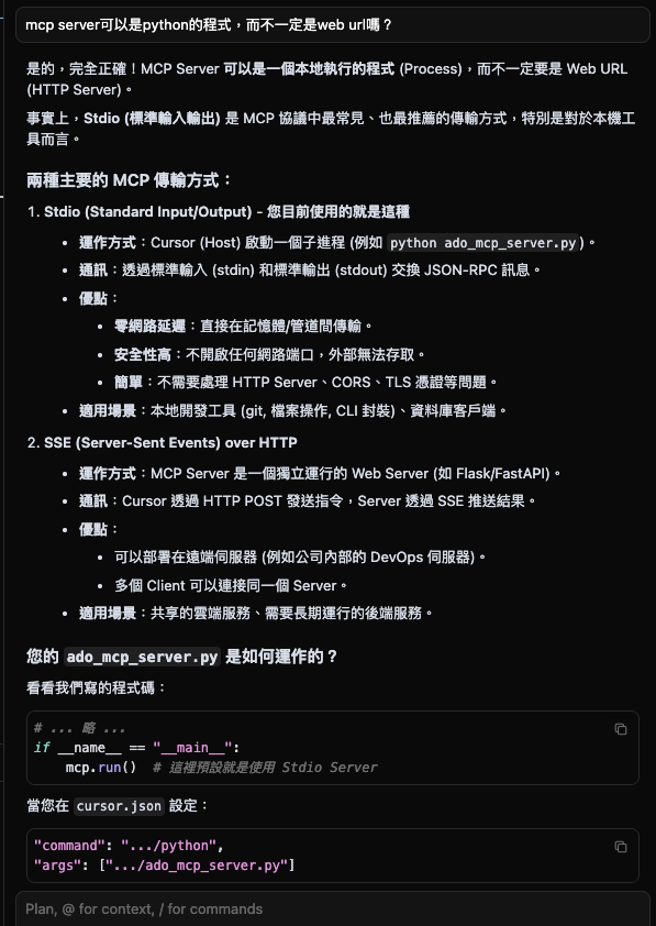 import os import sys import json import base64 import urllib.request import urllib.error import subprocess import ssl from typing import Optional from mcp.server.fastmcp import FastMCP # Initialize FastMCP Server mcp = FastMCP("AzureDevOps-Agent") # Constants ORG = "{OrgName}" PROJECT = "{TeamProject}" REPO = "{CodeRepository}" API_VERSION = "7.1" def get_pat() -> str: """Retrieve ADO PAT from environment or .ado_token file.""" pat = os.environ.get("ADO_PAT") if pat: return pat # Fallback to local file token_path = os.path.join(os.getcwd(), ".ado_token") if os.path.exists(token_path): try: with open(token_path, "r", encoding="utf-8") as f: return f.read().strip() except Exception: pass raise ValueError("ADO_PAT not found in environment variables or .ado_token file") def get_current_branch() -> str: """Get the current git branch.""" try: return subprocess.check_output(["git", "rev-parse", "--abbrev-ref", "HEAD"]).decode("utf-8").strip() except Exception as e: raise RuntimeError(f"Failed to determine current branch: {str(e)}") @mcp.tool() def create_pull_request(title: str, description: str, target_branch: str = "main", source_branch: Optional[str] = None) -> str: """ Create a Pull Request in Azure DevOps. Args: title: The title of the PR. description: The full description of the PR (markdown supported). target_branch: The branch to merge into (default: main). source_branch: The source branch (default: current git branch). """ try: pat = get_pat() actual_source = source_branch if source_branch else get_current_branch() url = f"https://dev.azure.com/{ORG}/{PROJECT}/_apis/git/repositories/{REPO}/pullrequests?api-version={API_VERSION}" # Format refs src_ref = actual_source if actual_source.startswith("refs/") else f"refs/heads/{actual_source}" target_ref = target_branch if target_branch.startswith("refs/") else f"refs/heads/{target_branch}" payload = { "sourceRefName": src_ref, "targetRefName": target_ref, "title": title, "description": description } # Auth header auth_str = f":{pat}" b64_auth = base64.b64encode(auth_str.encode()).decode() headers = { "Content-Type": "application/json", "Authorization": f"Basic {b64_auth}" } # SSL Context (Bypass for compatibility) ctx = ssl.create_default_context() ctx.check_hostname = False ctx.verify_mode = ssl.CERT_NONE req = urllib.request.Request(url, data=json.dumps(payload).encode(), headers=headers, method="POST") with urllib.request.urlopen(req, context=ctx) as response: response_data = json.loads(response.read().decode()) pr_url = response_data.get('url', '').replace( f'_apis/git/repositories/{REPO}/pullrequests/', f'_git/{REPO}/pullrequest/' ) return f"Successfully created PR #{response_data.get('pullRequestId')}: {pr_url}" except urllib.error.HTTPError as e: error_body = e.read().decode() return f"Failed to create PR. HTTP {e.code}: {error_body}" except ValueError as e: return f"Configuration Error: {str(e)}" except Exception as e: return f"Unexpected Error: {str(e)}" D @mcp.tool() def get_staged_diff() -> str: """ Get the git diff of staged changes (cached). Use this to analyze changes before generating commit messages or PR descriptions. """ try: # Run git diff --cached diff_output = subprocess.check_output(["git", "diff", "--cached"]).decode("utf-8") if not diff_output: return "No staged changes found." return diff_output except Exception as e: return f"Error reading git diff: {str(e)}" if __name__ == "__main__": mcp.run()//MCP Setting { "mcpServers": { "{org-team自行代入}-ado": { "command": "tools/mcp/.venv/bin/python", "args": ["tools/mcp/ado_mcp_server.py"] } } } MCP 啟用後的樣子(他可以是local的process,也可以是遠端的server) 透過MCP Setting,是提供AI的Model知道我們有哪些工具庫可以使用