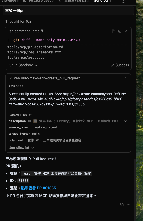 很快的,我取得PAT以後,告訴我的LocalAI,他很快的survey到AzureDevOps的 PR EndPoint